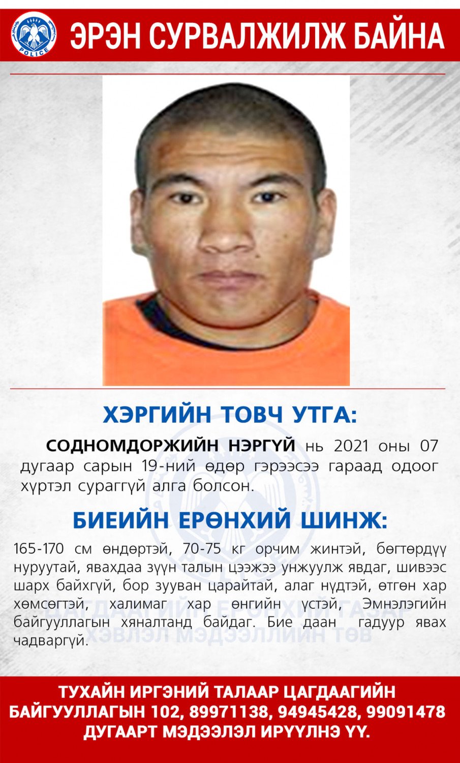 Хөгжлийн бэрхшээлтэй иргэн Содномдоржийн Нэргүй долоодугаар сарын 19-ний өдөр гэрээсээ гараад сураггүй болжээ. Тэрээр 165-170 см өндөртэй, 70-75 кг орчим жинтэй, бөгтөрдүү нуруутай, явахдаа зүүн талын цээжээ унжуулж явдаг. Ямар нэгэн шивээс, шархгүй.Тухайн иргэн эмнэлгийн байгууллагын хяналтад байдаг ба бие даан гадуур явах чадваргүй тул түүнийг харсан хүн байвал Цагдаагийн байгууллагын 102, 89971138 утсанд мэдээлэл өгнө үү хэмээн Цагдаагийн ерөнхий газраас мэдээллээ.