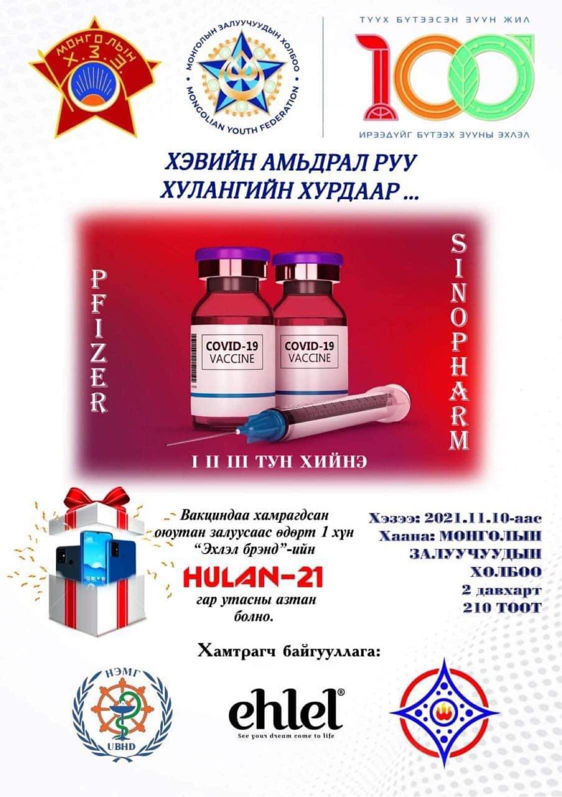 Дэлхийн хүн төрөлхтөн Ковид-19 хэмээх аюулт цар тахлын улмаас амьдралын цоо шинэ хэв маягт дасан зохицож амьдрах шаардлага нэгэнт бий болсон гэдэгтэй санал нэгдэх болсон. Ингэхдээ дархлаажуулалтын үндсэн дээр бидний өдөр тутмын амьдрал хэвийн үргэлжлэх боломжтой гэдэг нэгдмэл ойлголтод хүрээд байна. Манай улсын хувьд үүнтэй маргах хүн цөөн ч сүүлийн үед залуучуудын идэвх харьцангуй бага үзүүлэлттэй байгаа юм. Тиймээс Монгол залуучуудынхаа дархлааг дэмжихээр Монголын залуучуудын холбооноос урамшуулалт үйл ажиллагааг зохион байгуулахаар боллоо. Тодруулбал, 2021 оны арваннэгдүгээр сарын 10-ны өдрөөс МЗХ-ны байранд дархлаажуулалтын цэг ажиллуулж, тухайн цэгт вакцин хийлгэсэн оюутан залуучуудаас өдөр бүр нэг азтаныг тодруулан “Эхлэл брэнд”-ийн HULAN-21 гар утсаар урамшуулах болно.